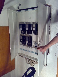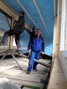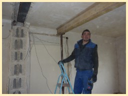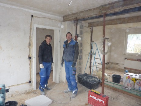 Herr Ziegler und Herr Tremel jun. bei der Montage einer neuen Elektroanlage in einer Altbauwohnung.